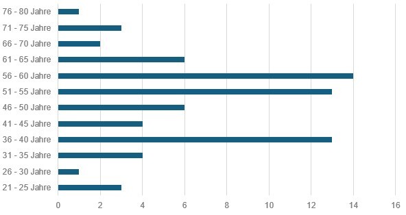 Der Abschnitt „Personenbezogene Angaben“ hat ergeben, dass das durchschnittliche Alter der Teilnehmenden zwischen 51 und 60 Jahren lag. Außerdem waren auch Teilnehmende im Alter zwischen 36 und 40 Jahren stark vertreten. Auffällig ist dagegen, dass Teilnehmende im Alter zwischen 21 und 30 Jahren gering vertreten waren.