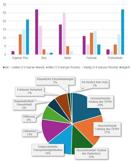 Ein Auszug im Themenbereich Mobilität zeigt, dass 61 Teilnehmende die Nachfrage zur Häufigkeit und Hemmnisse zu alternativen Fortbewegungsmitteln wie folgt beantwortet haben:
