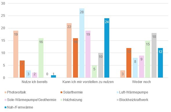 Bei der Abfrage, ob und welche erneuerbaren Energien zur Strom- und/oder Wärmeversorgung aktuell eingesetzt werden, haben 44 Teilnehmende abgestimmt. Dabei war auch die Abstimmung möglich, welche Technologie möglicherweise genutzt werden könnte.