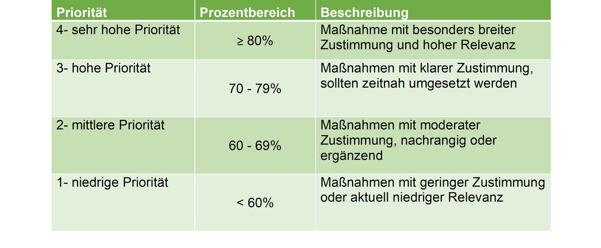 Zur besseren Übersicht wurden die Ergebnisse in Prozent der erreichbaren Maximalpunktzahl umgerechnet. Auf dieser Basis erfolgte eine Einordnung der Maßnahmen in vier Prioritätsstufen:
